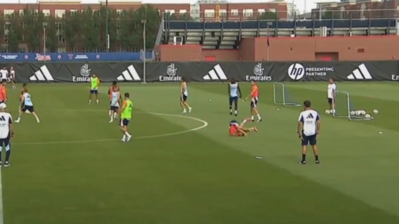 Real Madrid forması giyen milli futbolcu Arda Güler, Antonio Rudiger'in müdahalesi sonrası antrenmanda herkesin yüreğini ağzına getirdi.