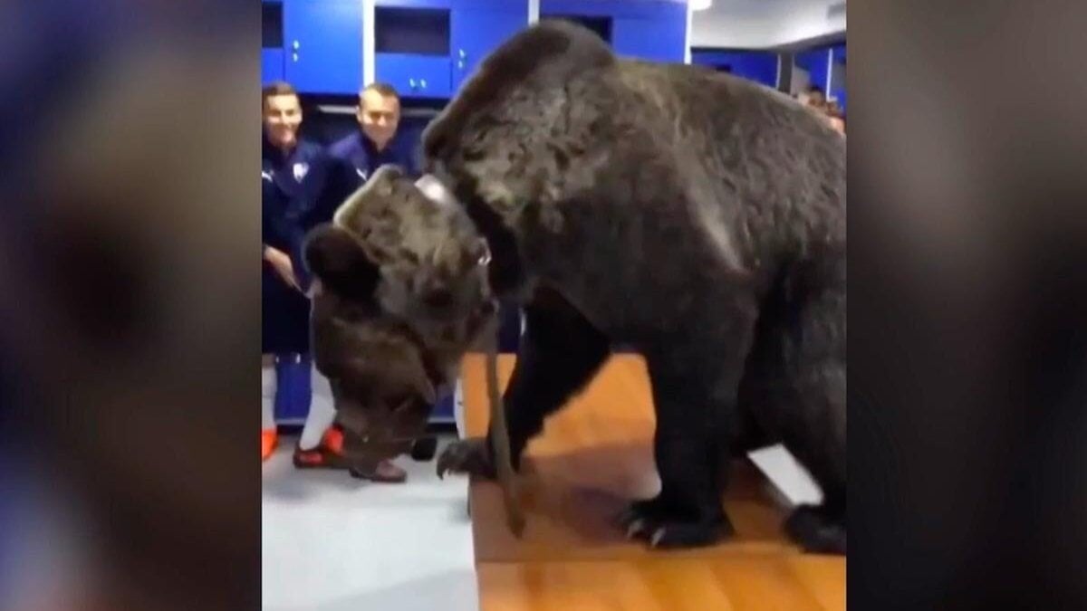 Ülkenin sembol hayvanlarından bir tanesi olarak gösterilen ayı, bir takımın soyunma odasına getirildi. Ayıyı karşılarında gören bazı futbolcular korkudan ne yapacaklarını bilemezken, bazı futbolcular bu enteresan anı telefonlarına kaydederek ölümsüzleştirdi.