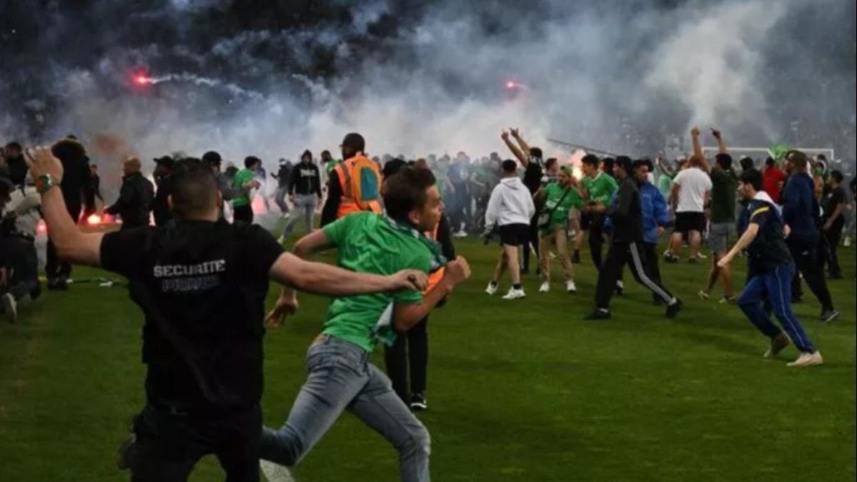 Meşalelerle sahaya giren, rakip takım oyuncuları ve güvenlik güçlerine saldıran Saint-Etienneli taraftarlar ortalığı birbirine kattı.