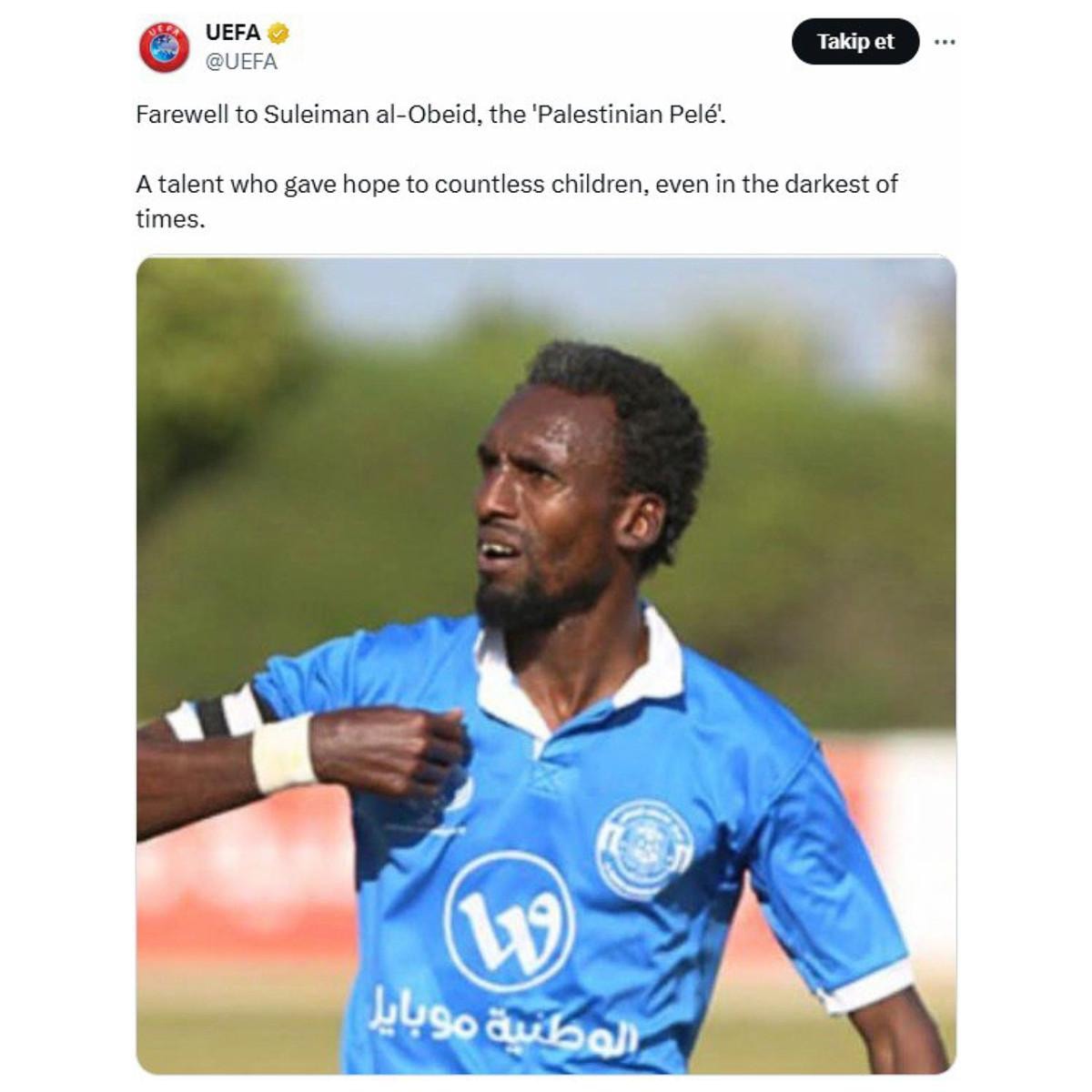İsrail'in saldırıları sırasında hayatını kaybeden Filistin futbolunun efsane isimlerinden olan ve "Filistinli Pele" lakaplı eski milli futbolcu Süleyman Al-Obaid için UEFA'nın daha önce yayımladığı taziye mesajı, tepkilerin odağı olmuştu.