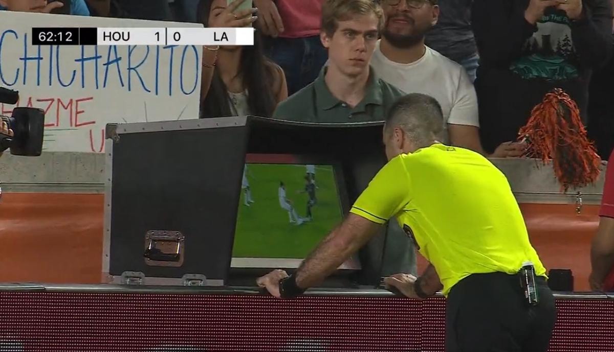 Los Angeles Galaxy forması giyen Uruguaylı yıldız oyuncu Martin Caceres, VAR'a giden hakemle birlikte pozisyonu inceledi.