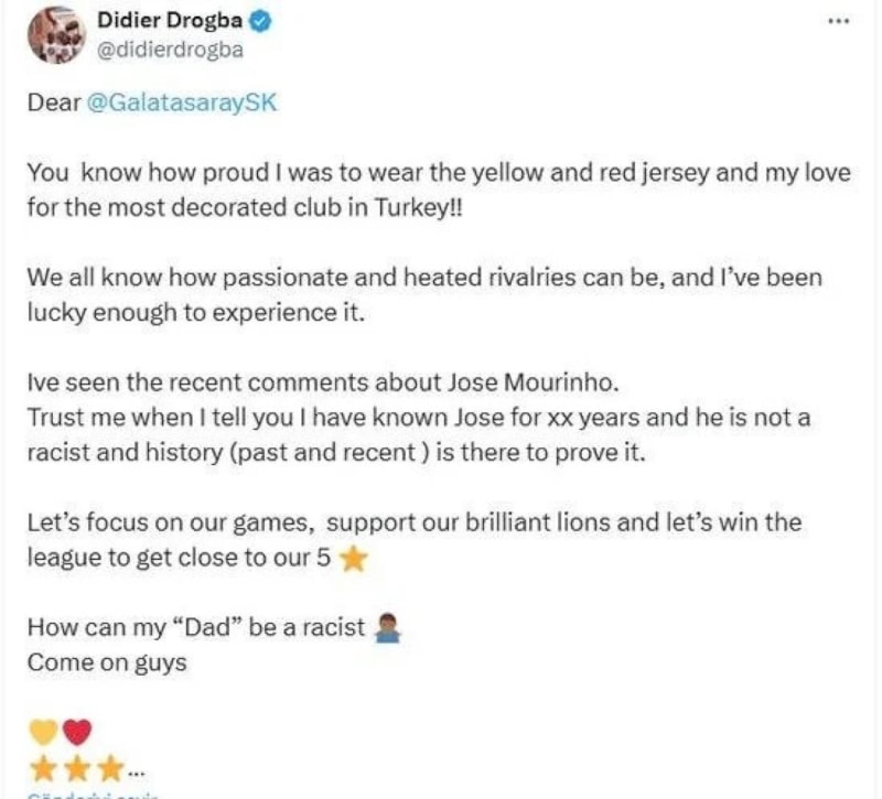 Futbolculuk kariyerinde Galatasaray'da forma giyen Didier Drogba, sarı-kırmızılı camiaya yönelik mesajında "Sevgili Galatasaray, sarı-kırmızılı formayı giymenin benim için ne kadar gurur verici olduğunu ve Türkiye'nin en çok kupa kazanan kulübüne olan sevgimi biliyorsunuz. Rekabetlerin ne kadar tutkulu ve hararetli olabileceğini hepimiz biliyoruz ve ben bunu deneyimleyecek kadar şanslıydım. Son zamanlarda Jose Mourinho hakkında yapılan yorumları gördüm. Bana güvenin, Jose'yi 25 yıldır tanıyorum ve o bir ırkçı değil; tarih bunu kanıtlıyor." ifadelerini kullandı.