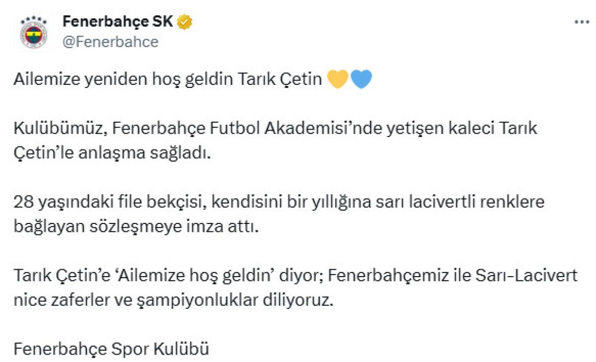 Tarık Çetin’e ‘Ailemize hoş geldin’ diyor; Fenerbahçemiz ile Sarı-Lacivert nice zaferler ve şampiyonluklar diliyoruz.