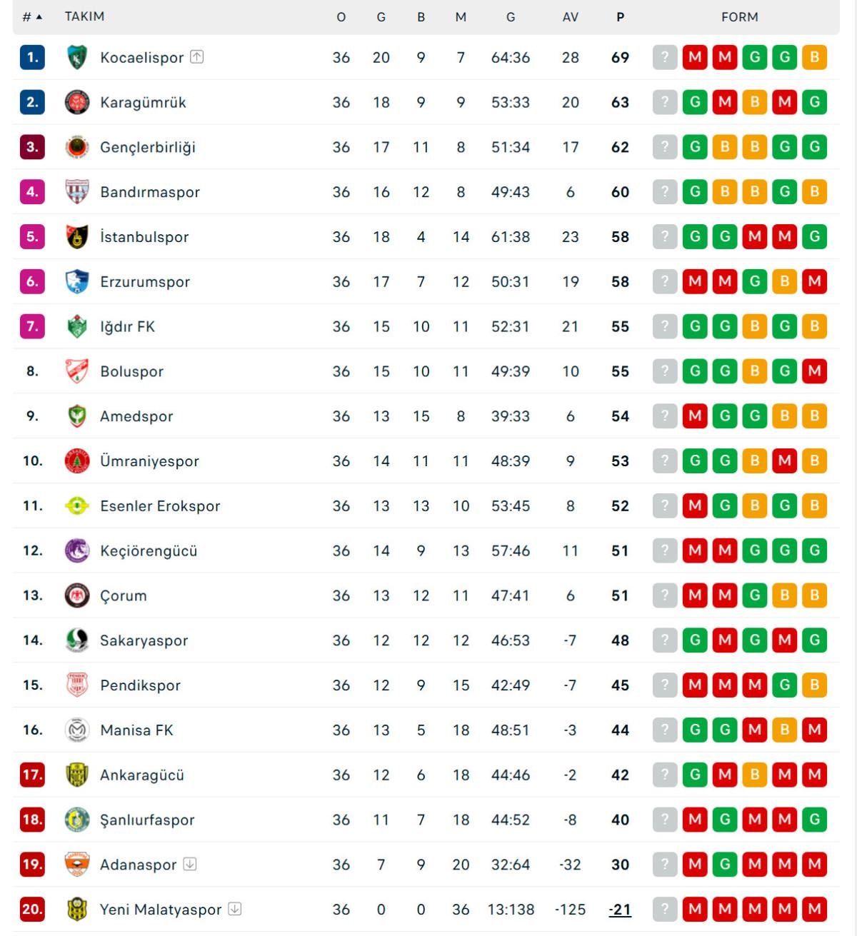 Geçen hafta Süper Lig'e çıkmayı garantileyen Kocaelispor'un Boluspor'a 4-3 yenildiği haftada 2. sıra için mücadelesini sürdüren ekiplerden 63 puanlı Fatih Karagümrük, 62 puana sahip Gençlerbirliği ve 60 puanlı Bandırmaspor haftayı galibiyetle kapatırken, deplasmanda Sakaryaspor'a 1-0 yenilen Erzurumspor FK ikincilik için uzakta kaldı.