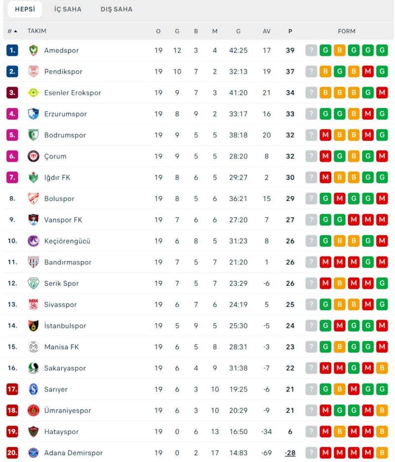 Küme düşme hattında ise 21 puanlı Sarıyer ve Ümraniyespor ile 6 puanlı Hatayspor ve FIFA'dan puan silme cezaları bulunan eksi 28 puanlı Adana Demirspor var.