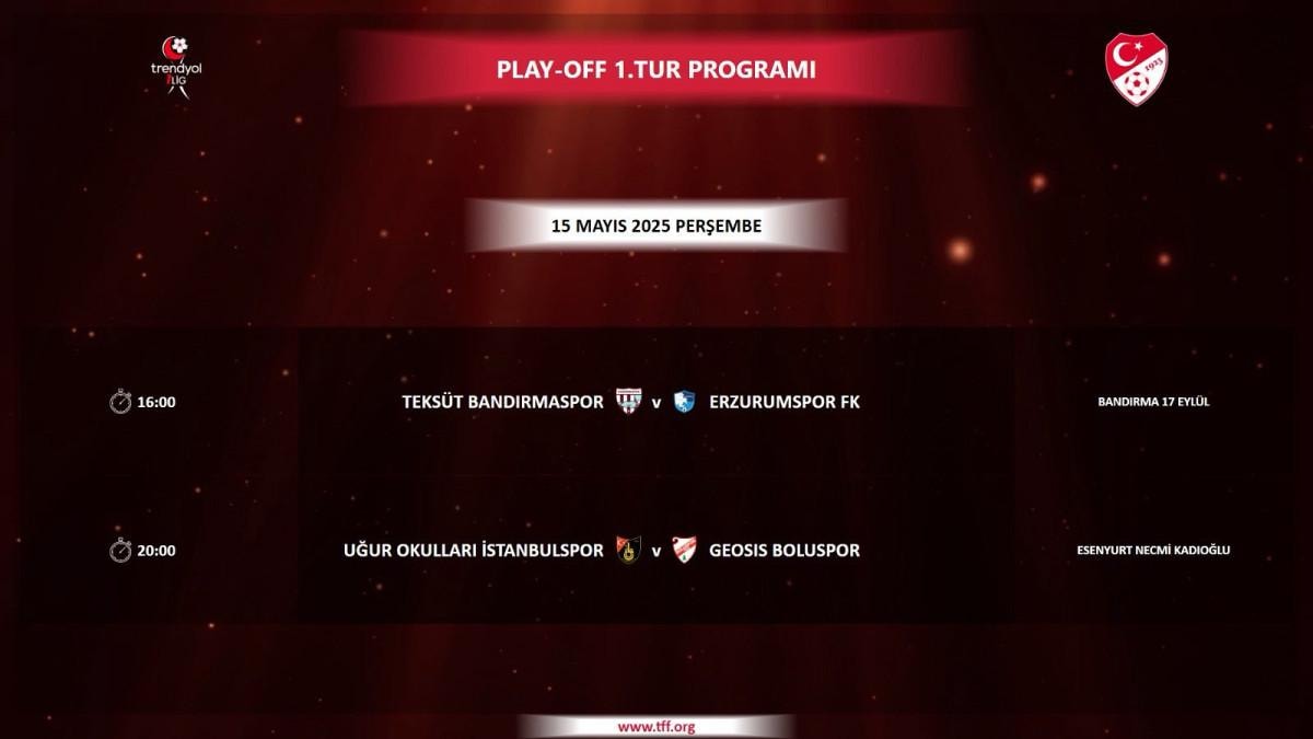 Türkiye Futbol Federasyonu'ndan yapılan açıklamaya göre, ligde normal sezonu 4, 5, 6 ve 7. sırada tamamlayan İstanbulspor, Bandırmaspor, Erzurumspor FK ve Boluspor'un mücadele edeceği play-off ilk tur müsabakaları, 15 Mayıs'ta oynanacak.