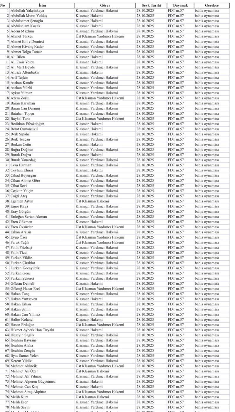80- Klasman Yardımcı Hakemi MERT ÖZTÜRK’ün futbol müsabakalarına ilişkin “bahis oynaması” nedeniyle Futbol Disiplin Talimatı’nın 57. maddesi uyarınca 28.10.2025 tarihinden itibaren tedbirli olarak PFDK'ya sevkine karar verilmiştir.