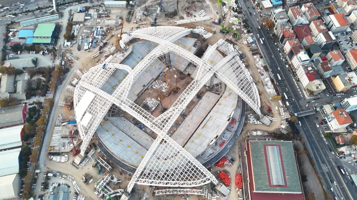 Drone ile kaydedilen son görüntülerde, stadyumun çelik çatısının montaj aşamasına geldiği ve yapısal iskeletin büyük ölçüde tamamlandığı görüldü.