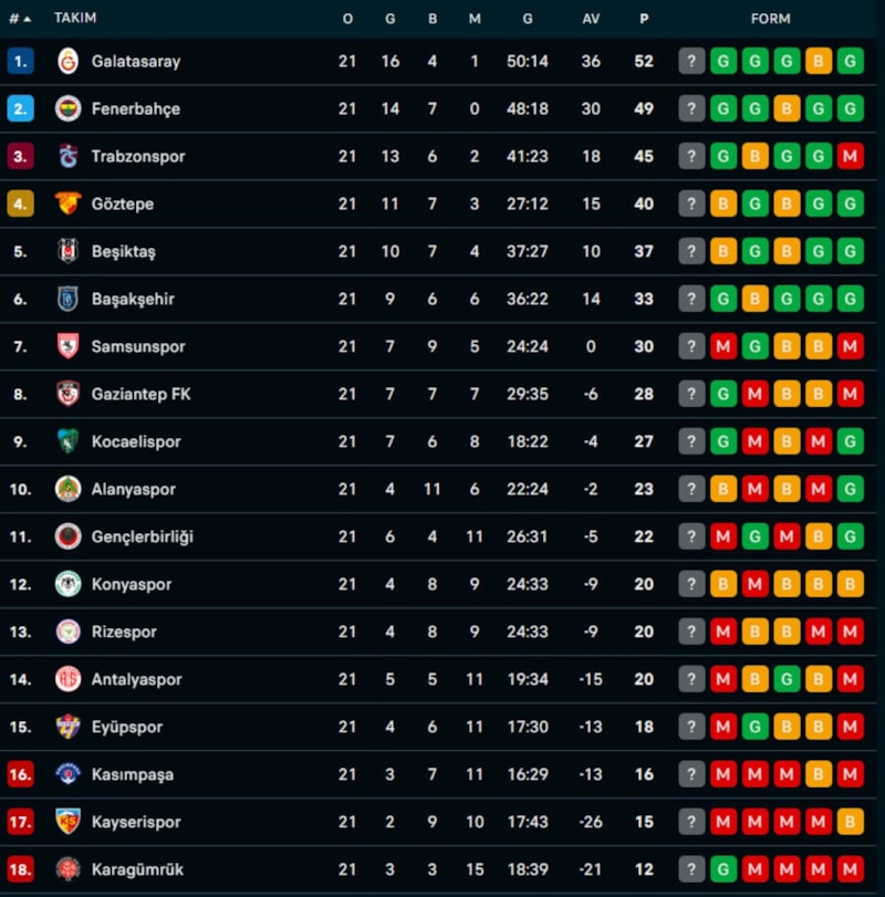 Haftaya en yakın takipçisi Fenerbahçe'nin 3 puan önünde giren Galatasaray 21. hafta mücadelelerinin ardından liderlik koltuğunu korudu.