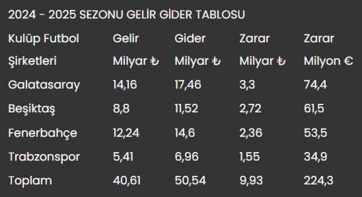 Türk futbolunun lokomotifleri olarak gösterilen Beşiktaş, Fenerbahçe, Galatasaray ve Trabzonspor, 2024-25 sezonunda 9,93 milyar lira zarara uğradı.