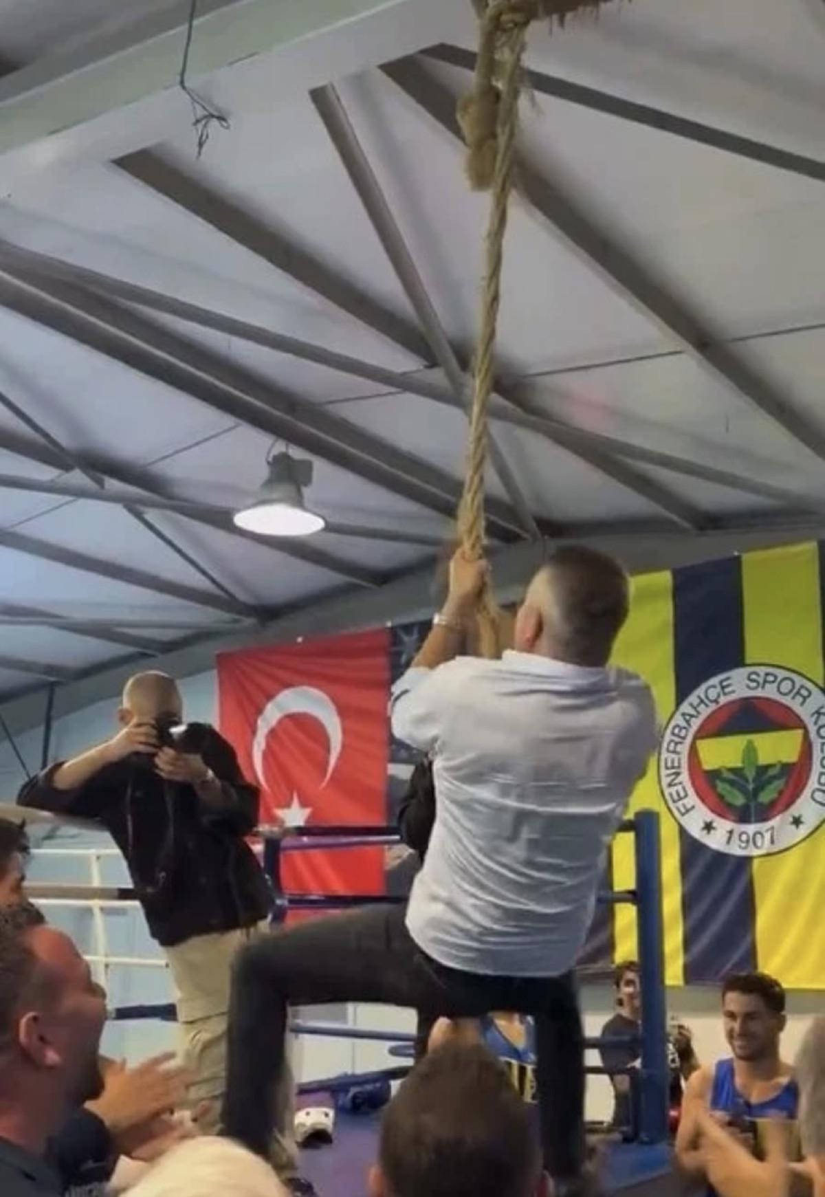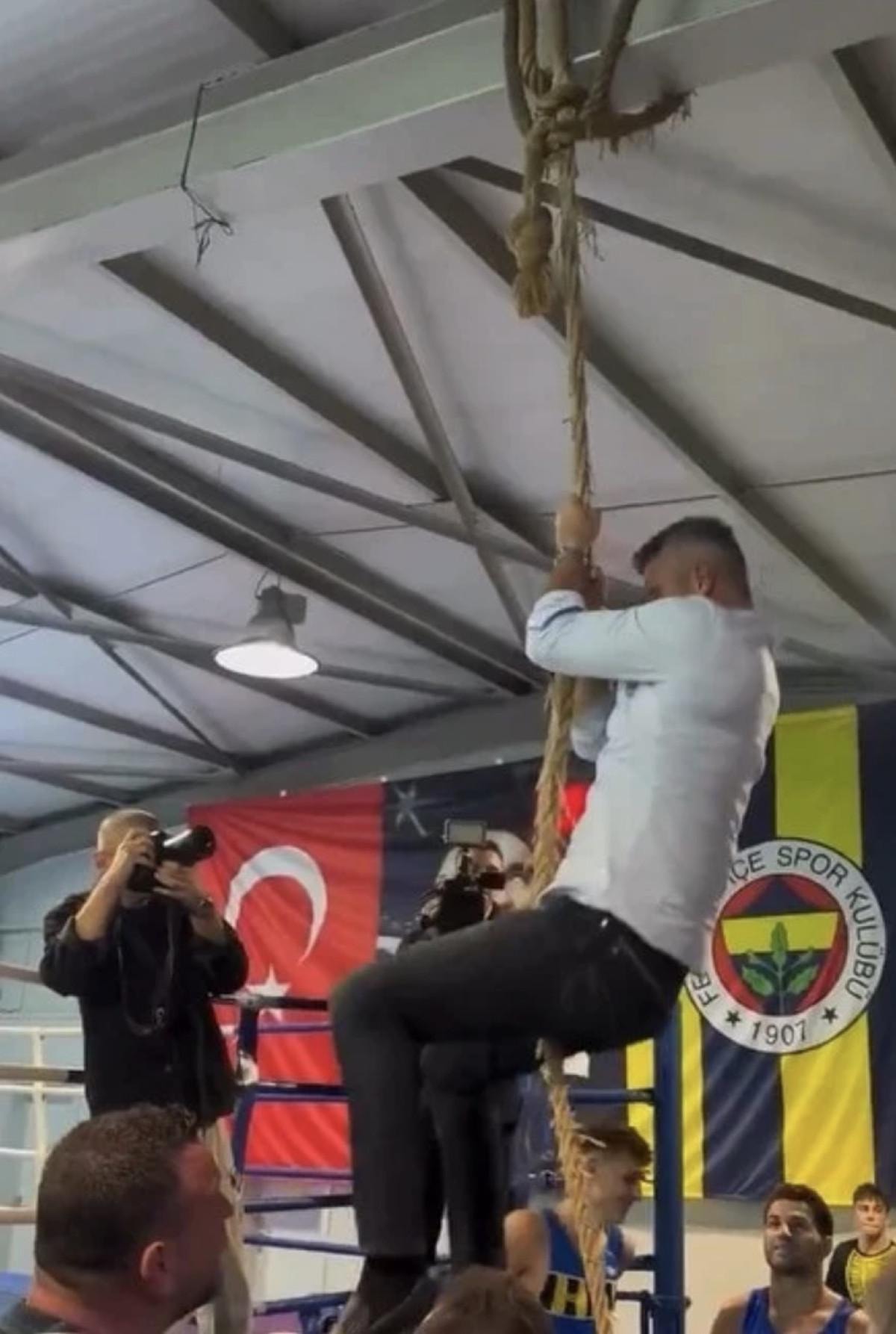 - Fenerbahçe Başkanı Sadettin Saran, genç boksörleri ziyareti sırasında üzerindeki gömlek ve kot pantolona rağmen halata tırmandı.