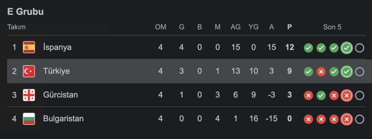 Bulgaristan'ın ardından Gürcistan'ı da farklı mağlup eden A Milli Takım, punaını 9'a çıkardı. 12 puandaki İspanya liderliğini sürdürürken, Gürcistan 3 puanda kaldı. Grup sonuncusu Bulgaristan'ın ise puanı bulunmuyor.