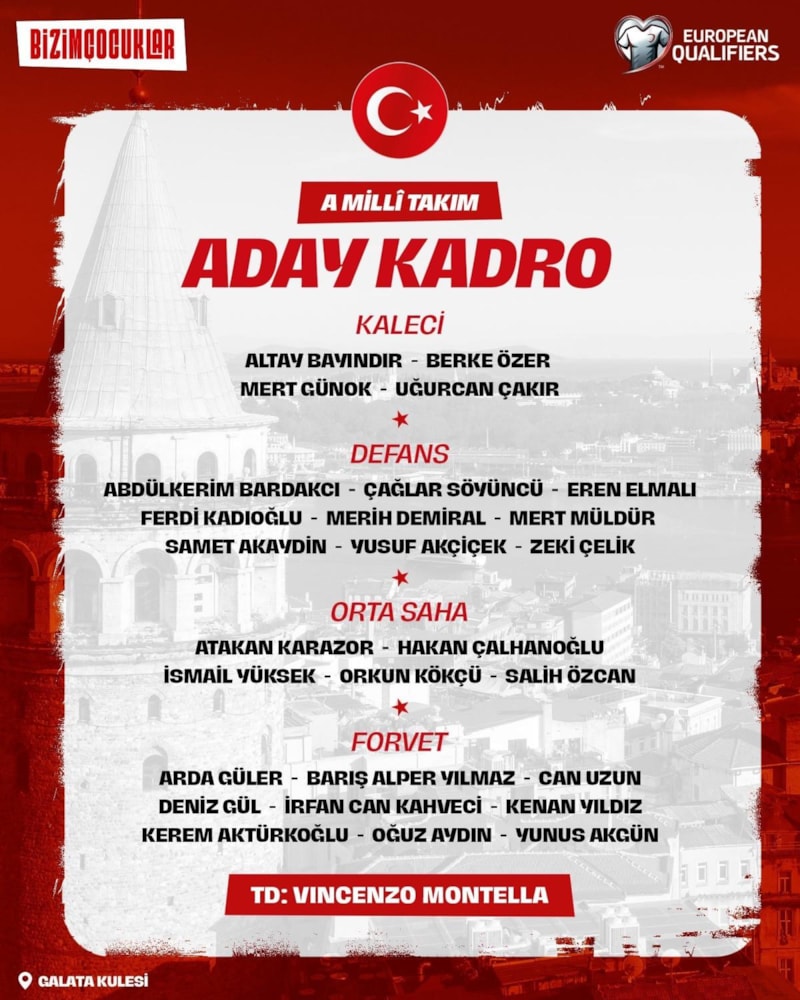 2026 FIFA Dünya Kupası Elemeleri'nde 11 Ekim'de deplasmanda Bulgaristan ve 14 Ekim'de Kocaeli'de Gürcistan'la karşılaşacak A Milli Takımımızın aday kadrosu açıklandı.