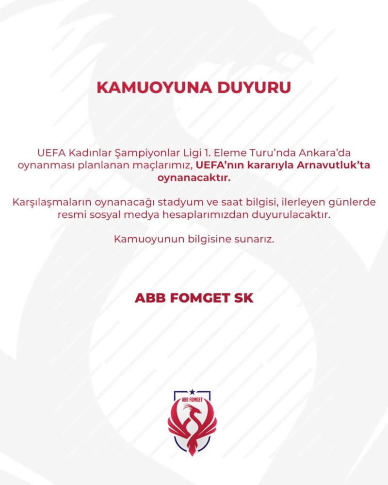 Kulüpten yapılan açıklamada, ABB Fomget'in daha önce Ankara'da oynanacağı planlanan UEFA Kadınlar Şampiyonlar Ligi 1. Eleme Turu maçlarının UEFA'nın kararıyla Arnavutluk'a alındığı bildirildi.