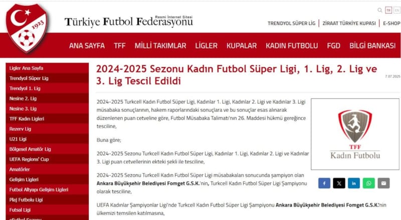 2024-2025 Sezonu Kadın Futbol Süper Ligi, Kadınlar 1. Ligi, Kadınlar 2. Ligi ve Kadınlar 3. Ligi puan cetvellerinin ekteki şekli ile tesciline, 2024-2025 Sezonu Turkcell Kadın Futbol Süper Ligi müsabakaları sonucunda şampiyon olan Ankara Büyükşehir Belediyesi Fomget G.S.K.'nin, Kadın Futbol Süper Ligi Şampiyonu olarak tesciline, UEFA Kadınlar Şampiyonlar Ligi'nde Kadın Futbol Süper Ligi Şampiyonu Ankara Büyükşehir Belediyesi Fomget G.S.K.'nin ülkemizi temsilen katılmasına, Türkiye Futbol Federasyonu Yönetim Kurulu'nun 02.07.2025 tarihli toplantısında karar verilmiştir.