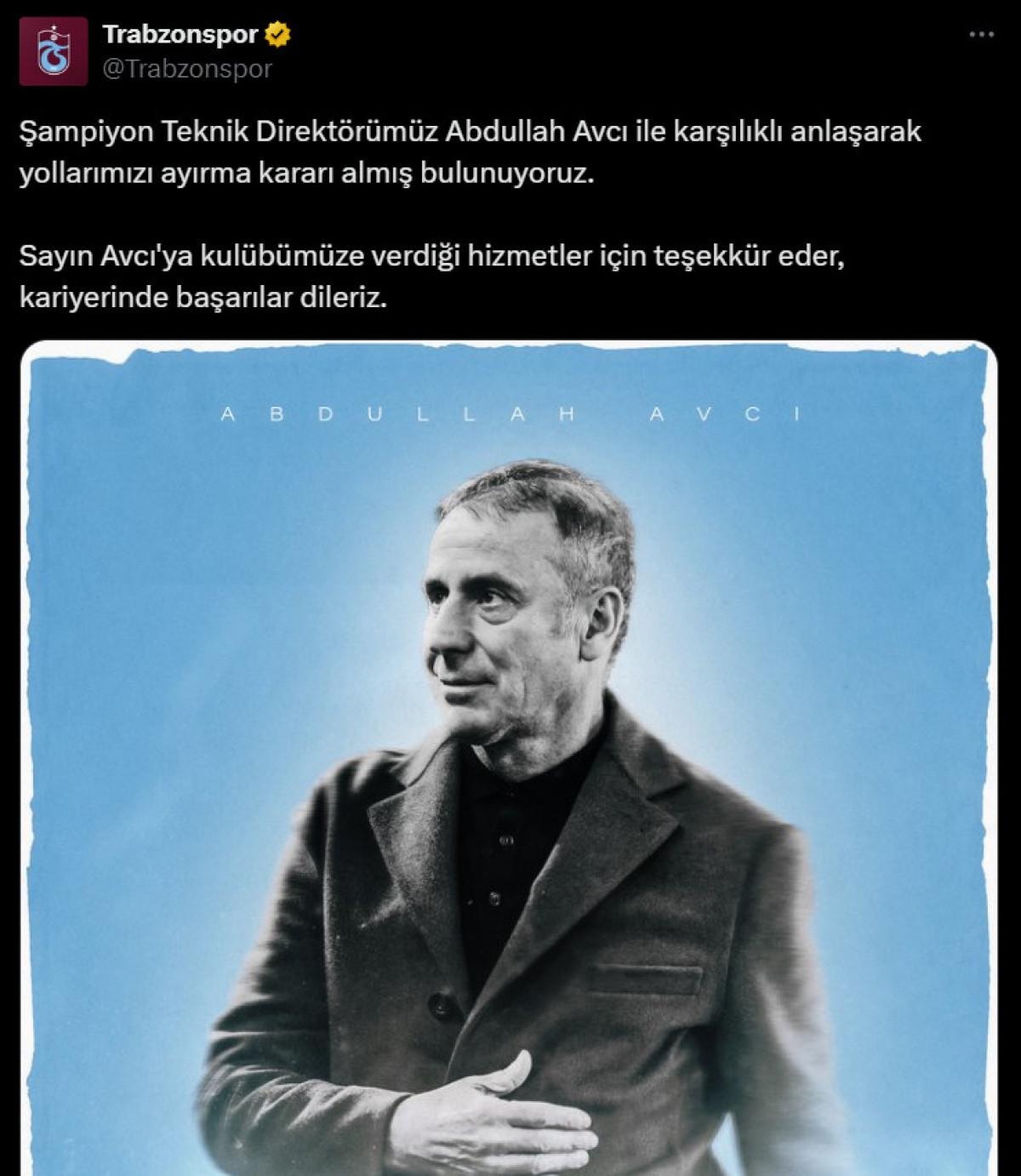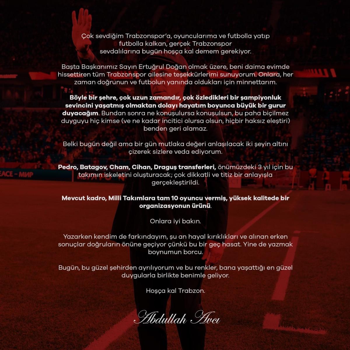 Yaşanan bu gelişmenin ardından ise teknik direktör Abdullah Avcı, veda mesajı yayınladı.