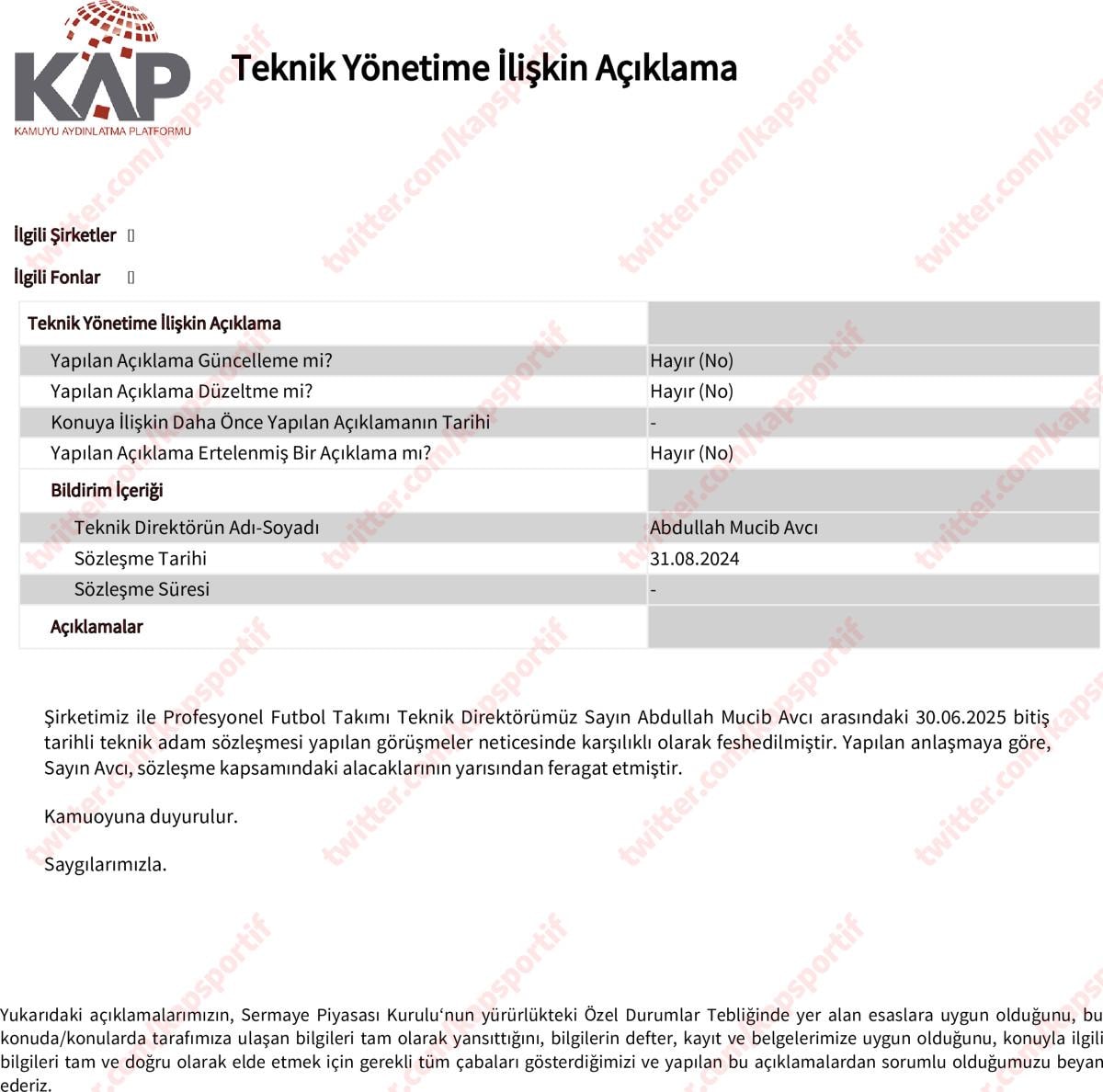 Şirketimiz ile Profesyonel Futbol Takımı Teknik Direktörümüz Sayın Abdullah Mucib Avcı arasındaki 30.06.2025 bitiş tarihli teknik adam sözleşmesi yapılan görüşmeler neticesinde karşılıklı olarak feshedilmiştir. Yapılan anlaşmaya göre, Sayın Avcı, sözleşme kapsamındaki alacaklarının yarısından feragat etmiştir.