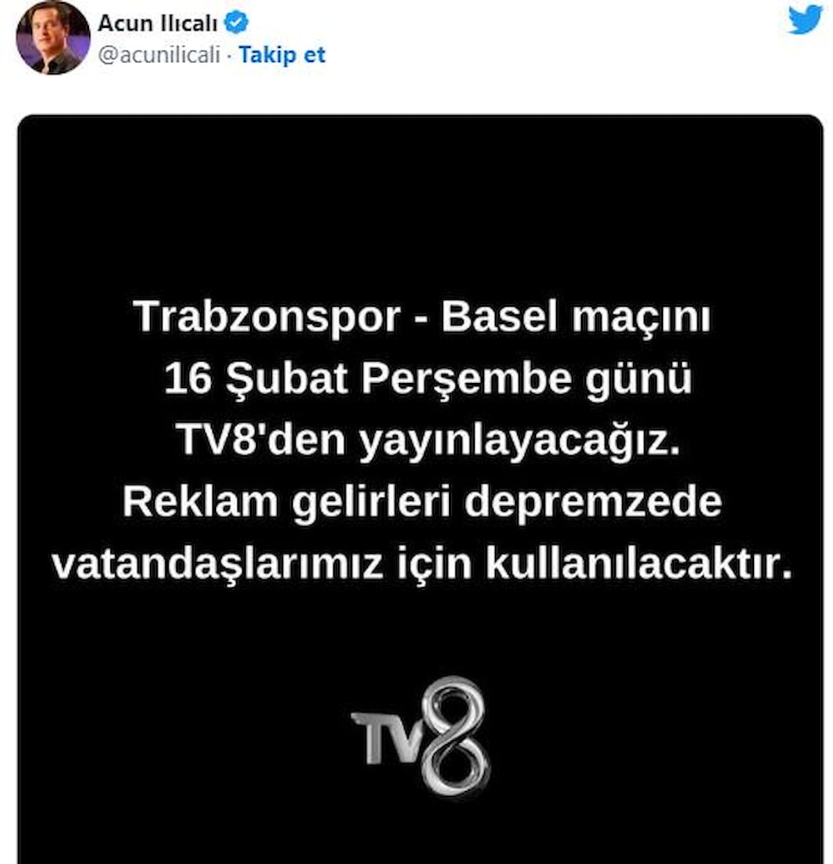 "16 Şubat Perşembe günü Trabzonspor - Basel maçını TV8'den yayınlayacağız. Reklam gelirleri depremzede vatandaşlarımız için kullanılacaktır."