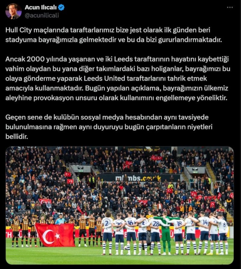 İngiltere Championship'te mücadele eden Hull City kulübünün, taraftarlarının Leeds United maçında stadyuma Türk bayrağı getirmemeleri yönündeki uyarısı sonrası Acun Ilıcalı sosyal medya hesabından açıklama yaptı.
