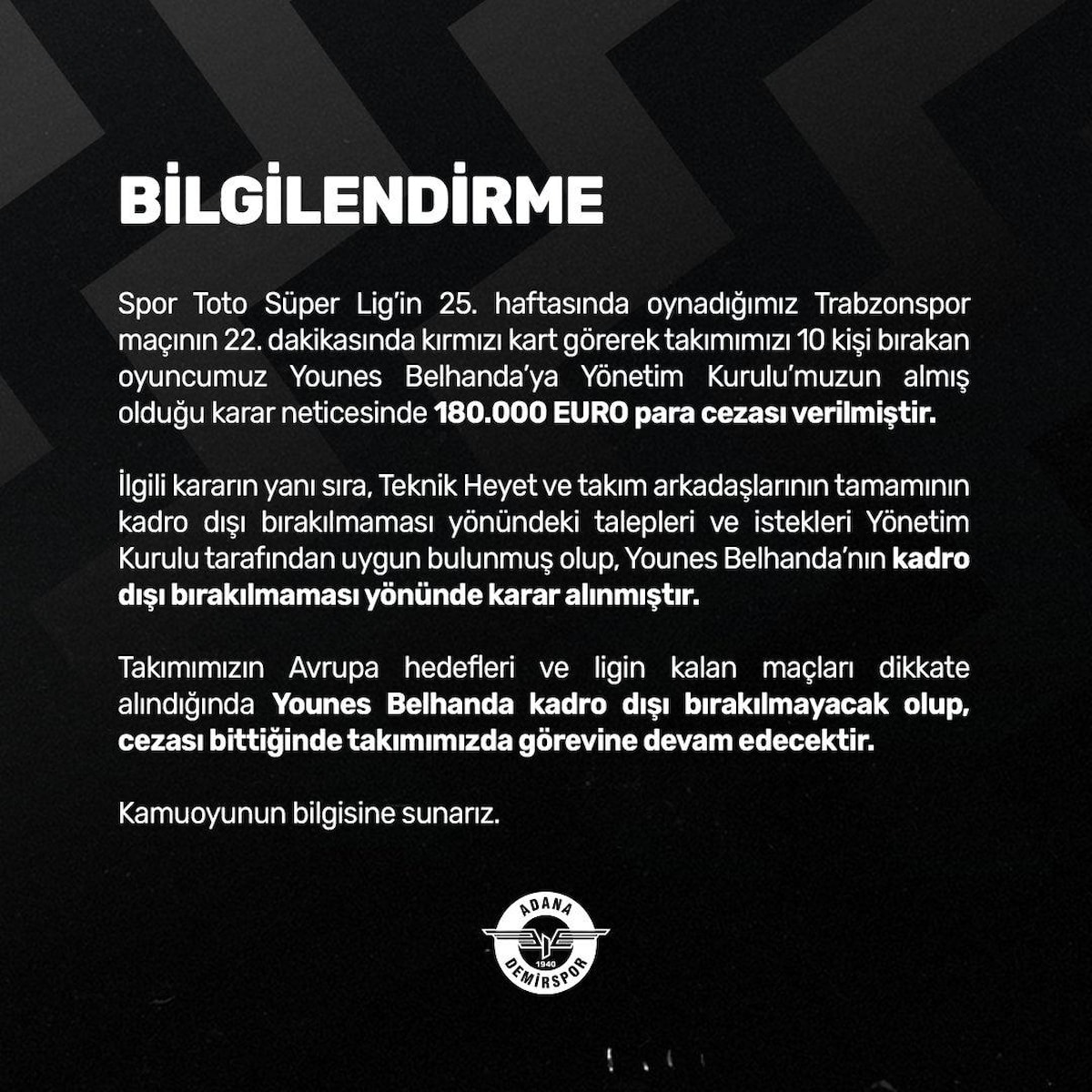 Takımımızın Avrupa hedefleri ve ligin kalan maçları dikkate alındığında Younes Belhanda kadro dışı bırakılmayacak olup, cezası bittiğinde takımızda görevinde devam edecektir."