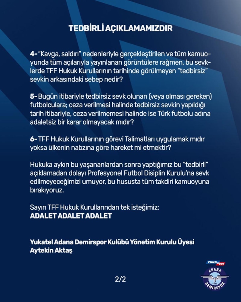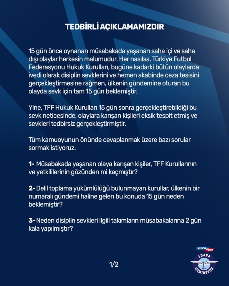 Adana ekibi, resmi hesabından açıklama yayınladı ve Türkiye Futbol Federasyonu'na 6 soru yöneltti.