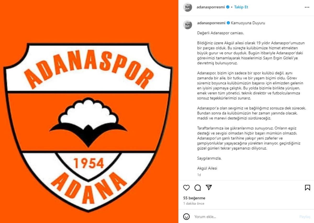 Bugün itibarıyla Adanaspor'daki görevimizi tamamlayarak hisselerimizi Sayın Ergin Göleli'ye devretmiş bulunuyoruz. Adanaspor, bizim için sadece bir spor kulübü değil, aynı zamanda bir aile, bir tutku ve bir yaşam biçimi oldu. Görev süremiz boyunca kulübümüzün başarısı için elimizden gelenin en iyisini yapmaya çalıştık. Bu yolda bizimle birlikte yürüyen, emek veren tüm yönetici, teknik direktör ve futbolcularımıza sonsuz teşekkürlerimizi sunarız. Adanaspor'a olan sevgimiz ve bağlılığımız sonsuza dek sürecek. Bundan sonra da kulübümüzün her zaman yanında olacak maddi ve manevi desteğimizi sürdüreceğiz.