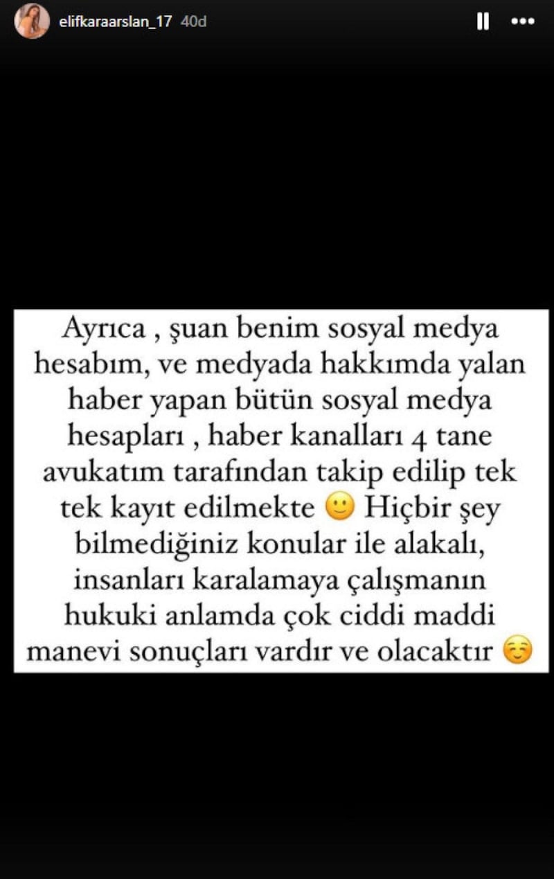 Ayrıca, şuan benim sosyal medya hesabım, ve medyada hakkımda yalan haber yapan bütün sosyal medya hesapları, haber kanalları 4 tane avukatım tarafından takip edilip tek tek kayıt edilmekte Hiçbir şey bilmediğiniz konular ile alakalı, insanları karalamaya çalışmanın hukuki anlamda çok ciddi maddi manevi sonuçları vardır ve olacaktır.