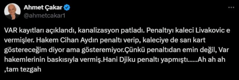 VAR kayıtları açıklandı, kanalizasyon patladı. Penaltıyı kaleci Livakovic'e vermişler. Hakem Cihan Aydın 'Penaltı verip, kaleciye de sarı kart göstereceğim' diyor ama gösteremiyor. Çünkü penaltıdan emin değil, VAR hakemlerinin baskısıyla vermiş. Hani Djiku penaltı yapmıştı... Ah ah ah, tam tezgah.