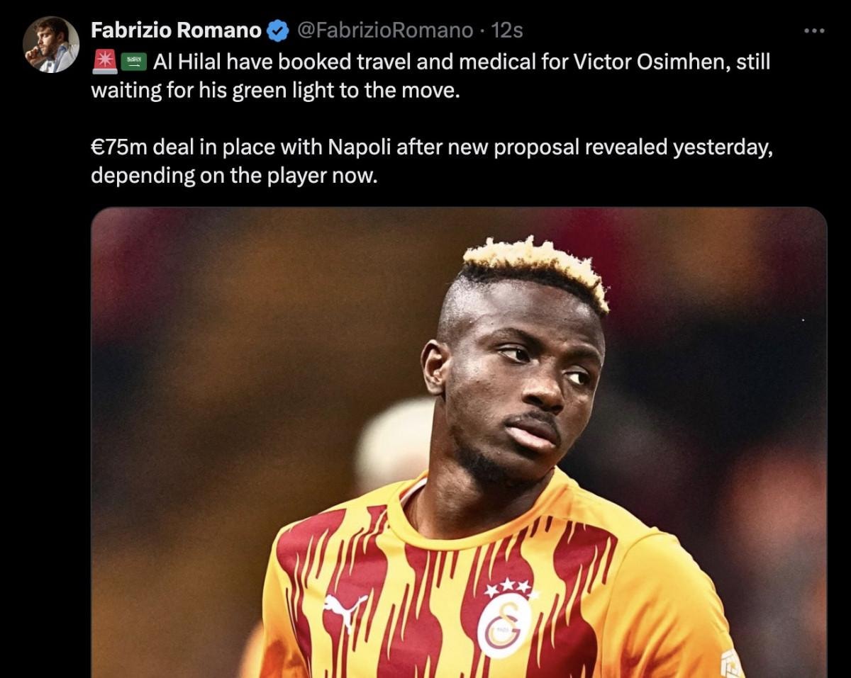 Ünlü gazeteci Fabrizio Romano'nun haberine göre Al Hilal, Victor Osimhen'in biletlerini hazırladı ve seyahat organizasyonu planını tamamladı.