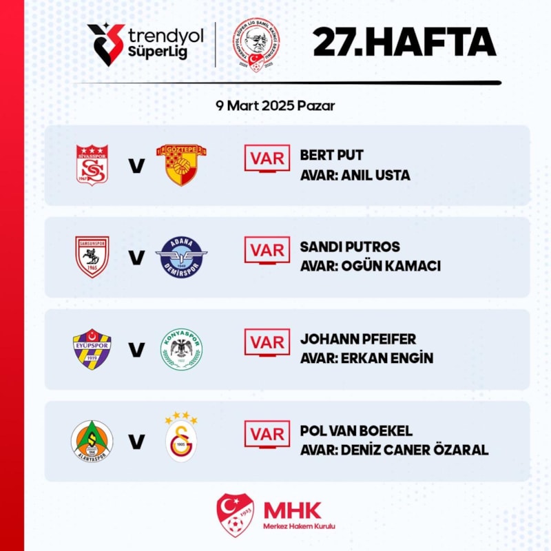 Öte yandan Süper Lig'de bugün oynanacak Sivasspor - Göztepe maçının VAR’ı Belçikalı Bert Put, Samsunspor - Adana Demirspor karşılaşmasının VAR’ı Danimarkalı Sandi Putros ve Eyüpspor - Konyaspor müsabakasının VAR’ı da Alman Johann Pfeifer oldu.