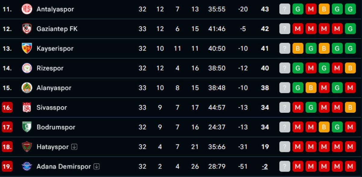 Gaziantep ise üst üste 4. yenilgisini alarak 42 puanda kaldı.