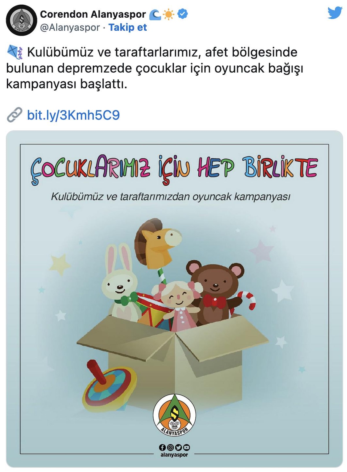 "Galatasaray ile oynayacağımız hazırlık maçında taraftarların getirdiği oyuncaklar, güvenlik noktalarında toplanacak. Toplanacak oyuncaklar daha sonra afet bölgelerine gönderilecek. Tüm taraftarlarımızı stadyuma oyuncakla gelerek kampanyaya destek olmaya davet ediyoruz."