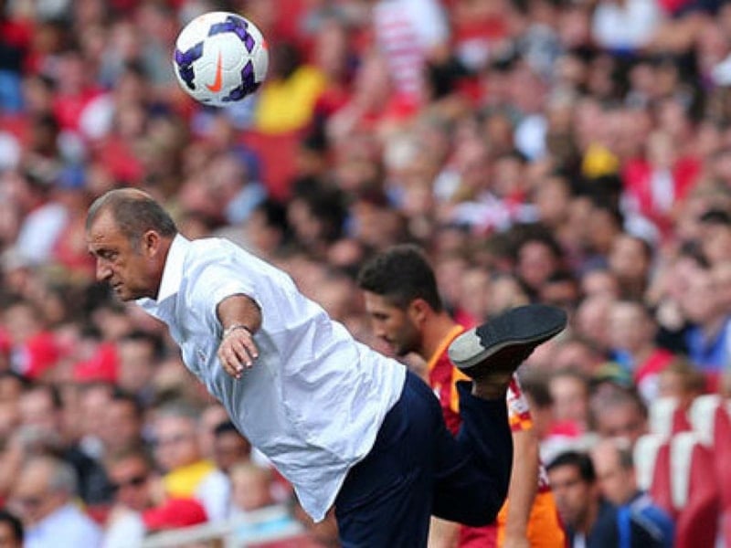 Mücadelenin 18. dakikasında Konyaspor'un genç teknik direktörü Ali Çamdalı, kendisine doğru gelen topu Fatih Terim'le özdeşleşen akrep hareketiyle karşıladı.