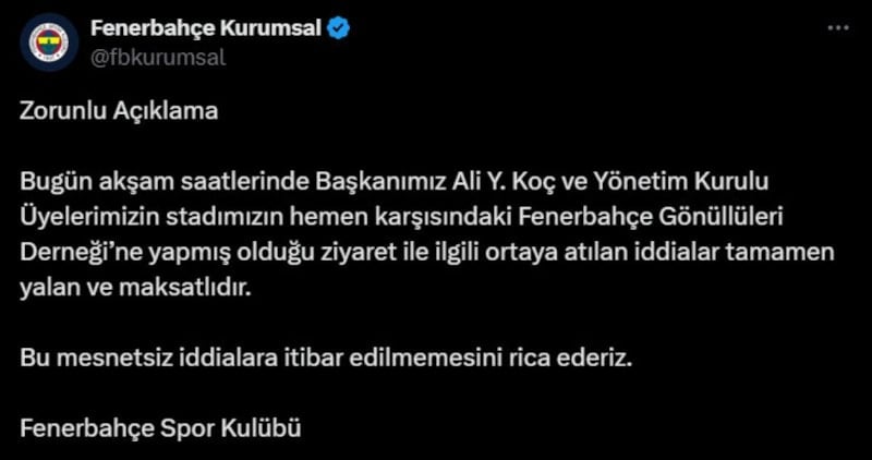 Bugün akşam saatlerinde Başkanımız Ali Y. Koç ve Yönetim Kurulu Üyelerimizin stadımızın hemen karşısındaki Fenerbahçe Gönüllüleri Derneği’ne yapmış olduğu ziyaret ile ilgili ortaya atılan iddialar tamamen yalan ve maksatlıdır. Bu mesnetsiz iddialara itibar edilmemesini rica ederiz.