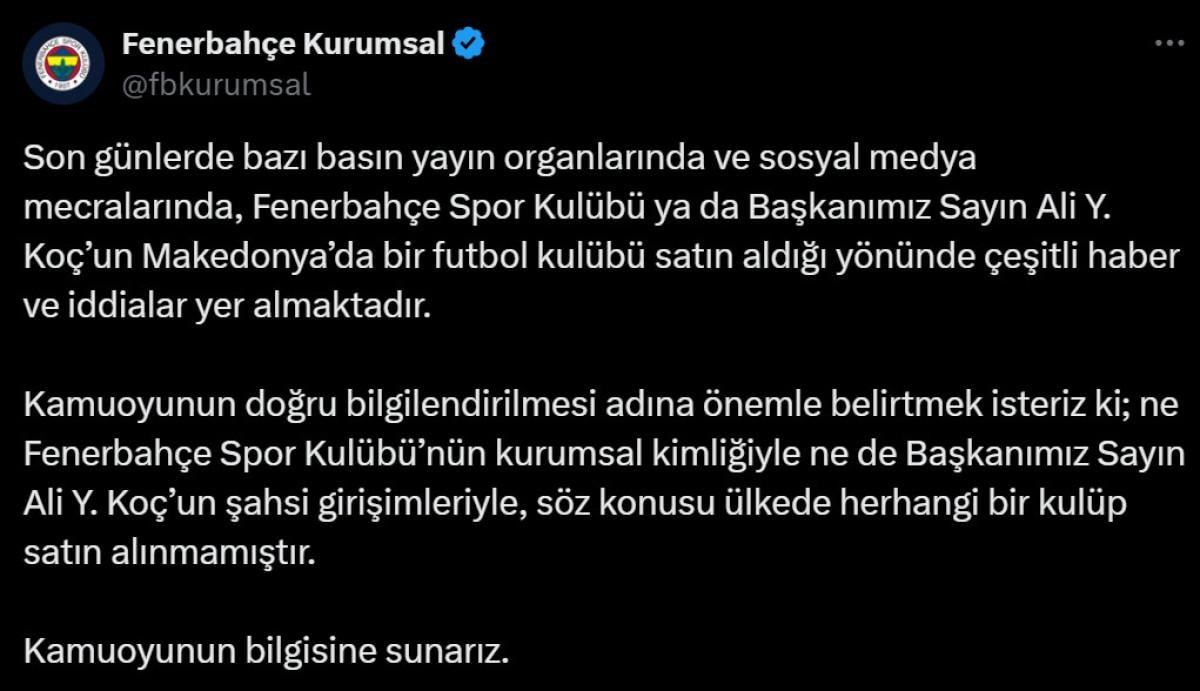 Son günlerde bazı basın yayın organlarında ve sosyal medya mecralarında, Fenerbahçe Spor Kulübü ya da Başkanımız Sayın Ali Y. Koç’un Makedonya’da bir futbol kulübü satın aldığı yönünde çeşitli haber ve iddialar yer almaktadır.