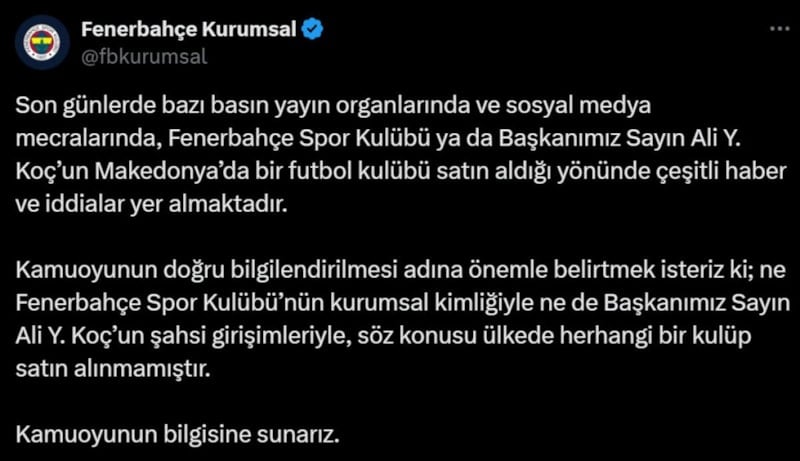 Fenerbahçe, resmi hesabından Kuzey Makedonya'da kulüp satın alındığı iddialarını yalanladı.