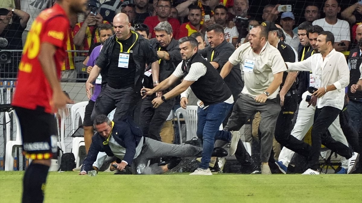 Bu sırada üzerine yabancı maddeler atılan Koç, tribününden ayrılıp saha kenarında yürüdüğü sırada aldığı bir darbeyle yere düştü. Daha sonra yerden kalkan Koç, korumaları eşliğinde sahadan çıkarıldı.