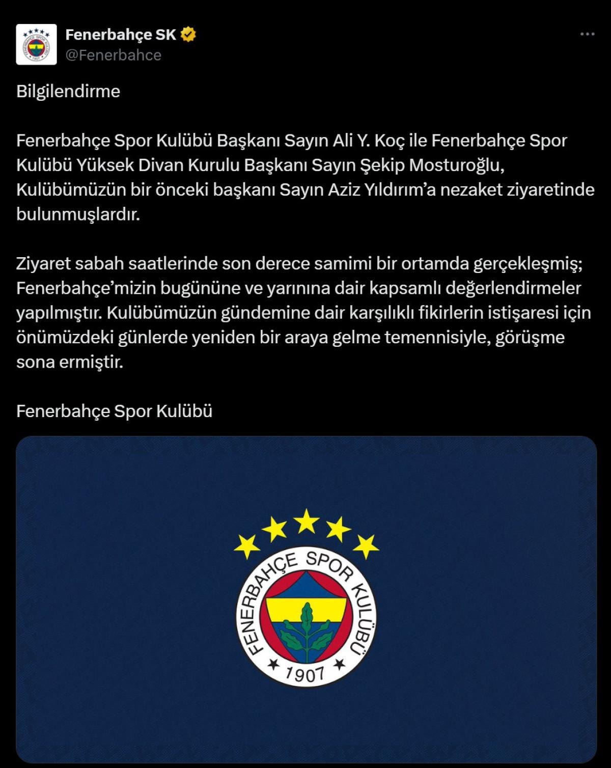 Sarı-lacivertliler Ali Koç ve efsane başkan Aziz Yıldırım'ın görüşme yaptığını duyurdu.