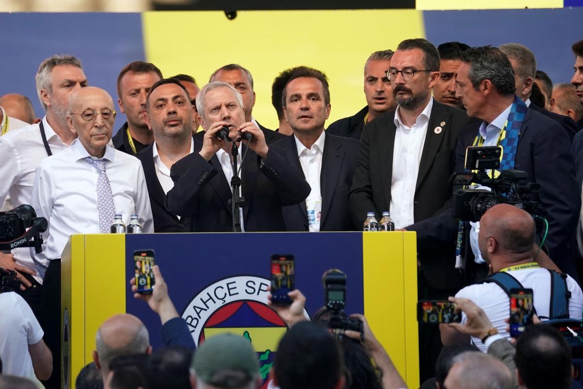 Şükrü Saraçoğlu Stadı'nda gerçekleştirilen seçimin ardından oyların sayılması sırasında başkan adaylarından Ali Koç tezahüratlar eşliğinde sahaya çıktı.