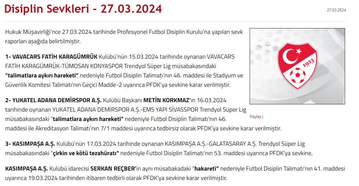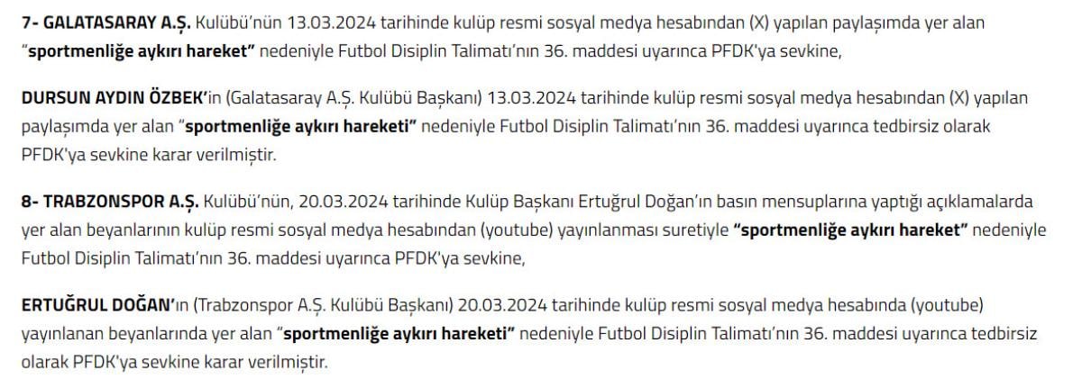 DURSUN AYDIN ÖZBEK’in (Galatasaray A.Ş. Kulübü Başkanı) 13.03.2024 tarihinde kulüp resmi sosyal medya hesabından (X) yapılan paylaşımda yer alan “sportmenliğe aykırı hareketi” nedeniyle Futbol Disiplin Talimatı’nın 36. maddesi uyarınca tedbirsiz olarak PFDK'ya sevkine karar verilmiştir.