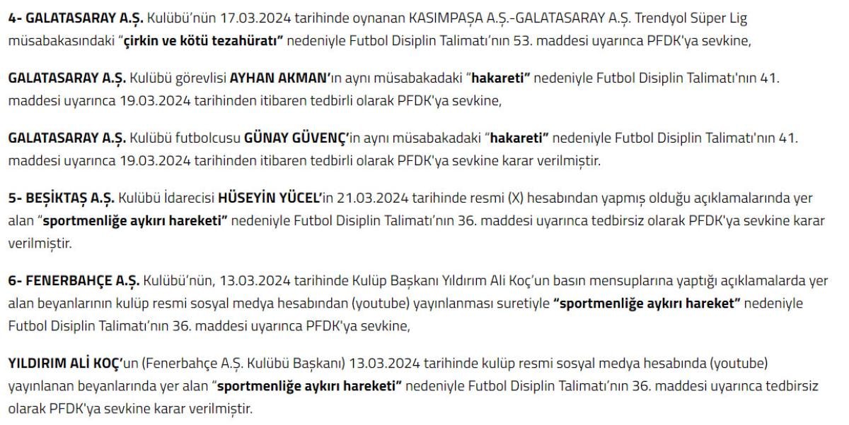 6- FENERBAHÇE A.Ş. Kulübü’nün, 13.03.2024 tarihinde Kulüp Başkanı Yıldırım Ali Koç’un basın mensuplarına yaptığı açıklamalarda yer alan beyanlarının kulüp resmi sosyal medya hesabından (YouTube) yayınlanması suretiyle “sportmenliğe aykırı hareket” nedeniyle Futbol Disiplin Talimatı’nın 36. maddesi uyarınca PFDK'ya sevkine,