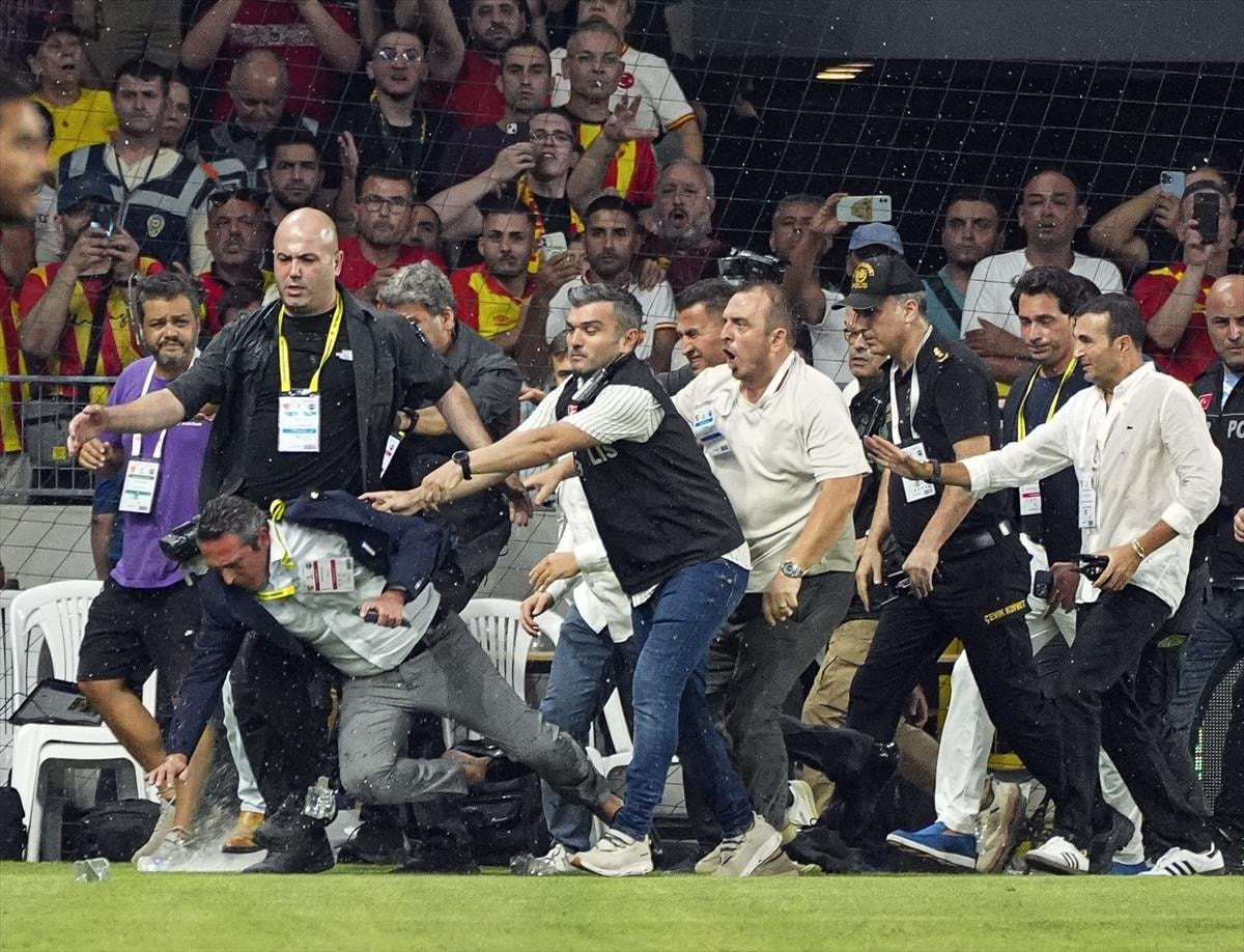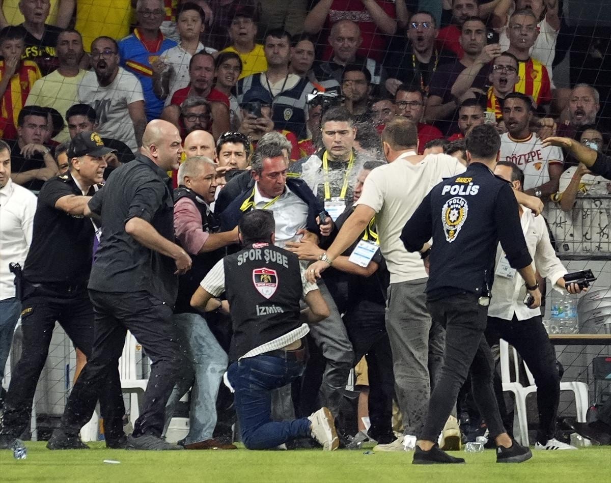 Bir şişenin isabet etmesiyle Ali Koç yerde kalırken daha sonra ev sahibi kulüp görevlileri ile Ali Koç ve korumaları arasında arbede yaşandı.