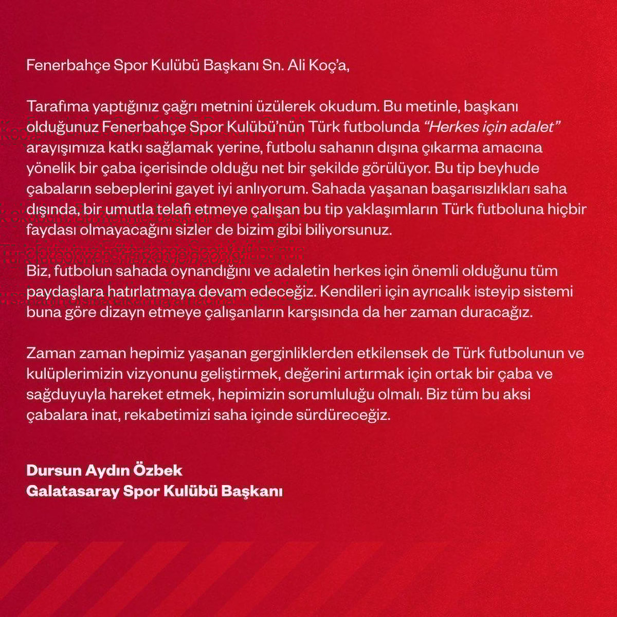 Şahsınıza açık, net ve mertçe bir çağrı yapıyorum: Gerçekten adalet, adil rekabet ve hakkaniyet arayışınız varsa, Attığınız adımları savunduğunuz gibi Türk futbolunun marka değeri için yapıyorsanız, Tüm kamuoyu önünde kim haklı kim haksız kim doğruları söylüyor kim söylemiyor kamuoyu tarafından bilinmesinin zamanı gelmiş ve geçmiştir.