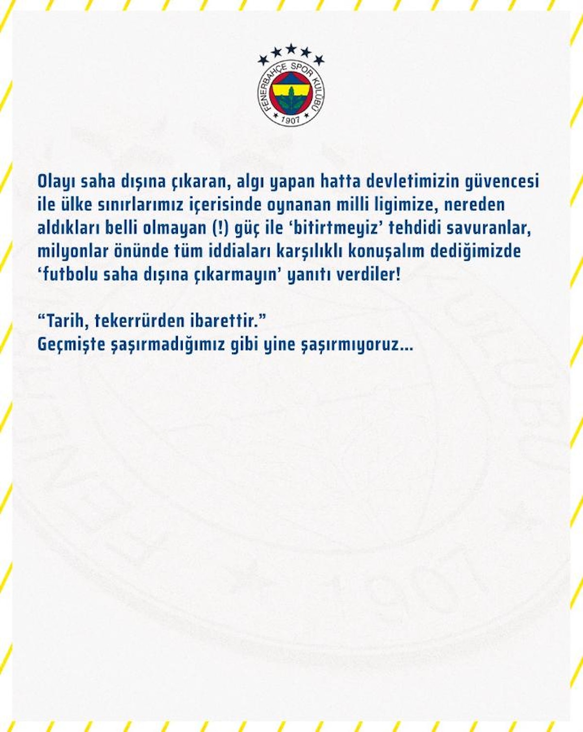 "Olayı saha dışına çıkaran, algı yapan hatta devletimizin güvencesi ile ülke sınırlarımız içerisinde oynanan milli ligimize, nereden aldıkları belli olmayan (!) güç ile ‘bitirtmeyiz’ tehdidi savuranlar, milyonlar önünde tüm iddiaları karşılıklı konuşalım dediğimizde ‘futbolu saha dışına çıkartmayın’ yanıtı verdiler! 'Tarih tekerrürden ibarettir.' Geçmişte şaşırmadığımız gibi yine şaşırmıyoruz”