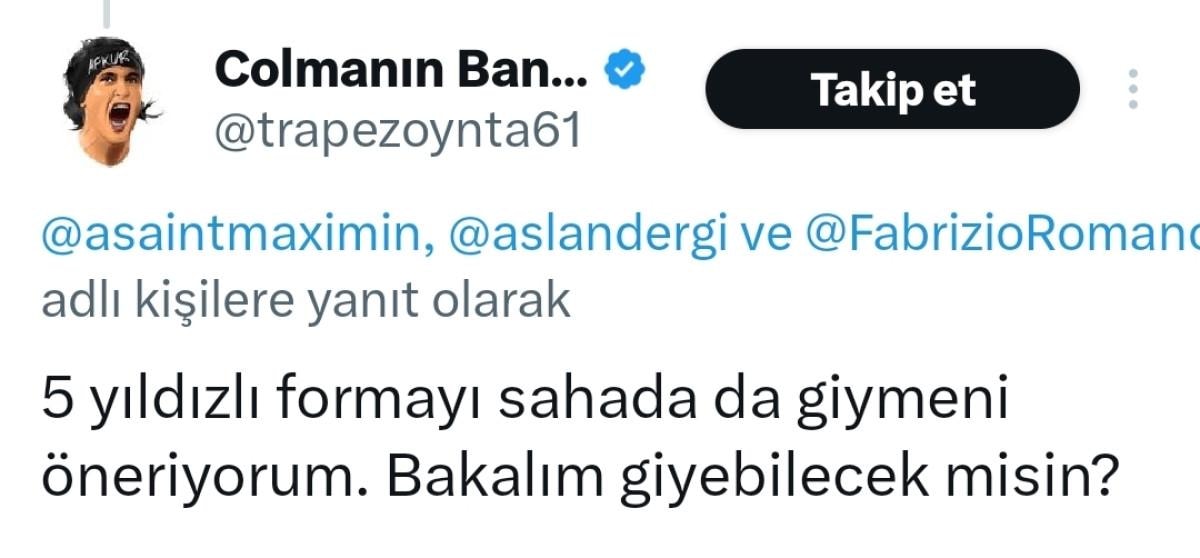Bir Trabzonspor sayfası ise aynı gönderiye, "5 yıldızlı formayı sahada da giymeni öneriyorum. Bakalım giyebilecek misin?" yorumunu yazdı.