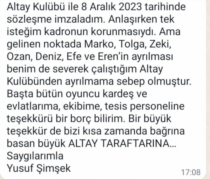 Gelinen noktada Marco Paixao, Zeki Yıldırım Ozan Evrim Özenç, Deniz Kadah Efe Sarıkaya ve Eren Erdoğan’ın ayrılması benimde severek çalıştığım Altay’dan ayrılmama sebep oldu. Başta bütün oyuncu kardeşlerimi ve evlatlarıma, ekibime, tesis personeline teşekkürü borç bilirim. Bir büyük teşekkür de bizi kısa zamanda bağrına basan Büyük Altay taraftarına.