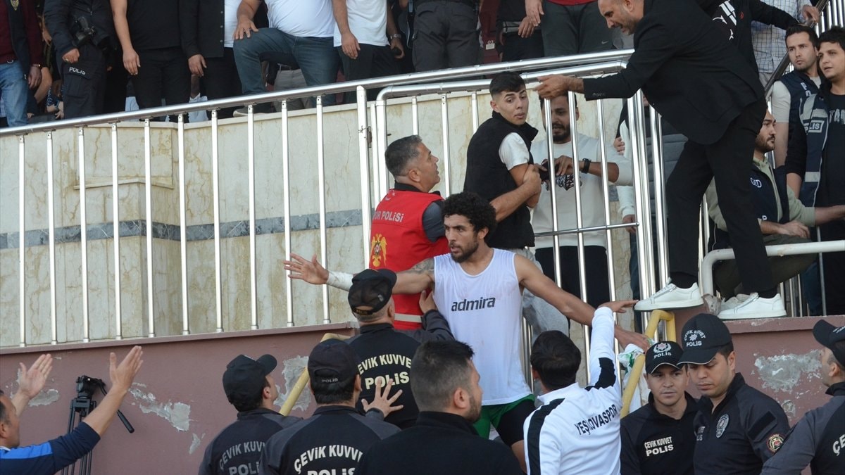 Misafir ve ev sahibi takımın oyuncuları gerginlik yaşarken, tribünlere de yansıyan olaylarda sahaya giren taraftarlara polis ekipleri müdahale etti.