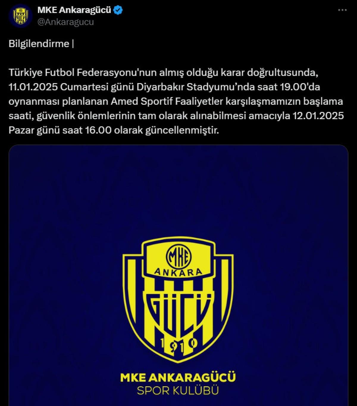 Türkiye Futbol Federasyonunun almış olduğu karar doğrultusunda, 11.01.2025 Cumartesi günü Diyarbakır Stadyumu'nda saat 19.00'da oynanması planlanan Amed Sportif Faaliyetler karşılaşmamızın başlama saati, güvenlik önlemlerinin tam olarak alınabilmesi amacıyla 12.01.2025 Pazar günü saat 16.00 olarak güncellenmiştir.