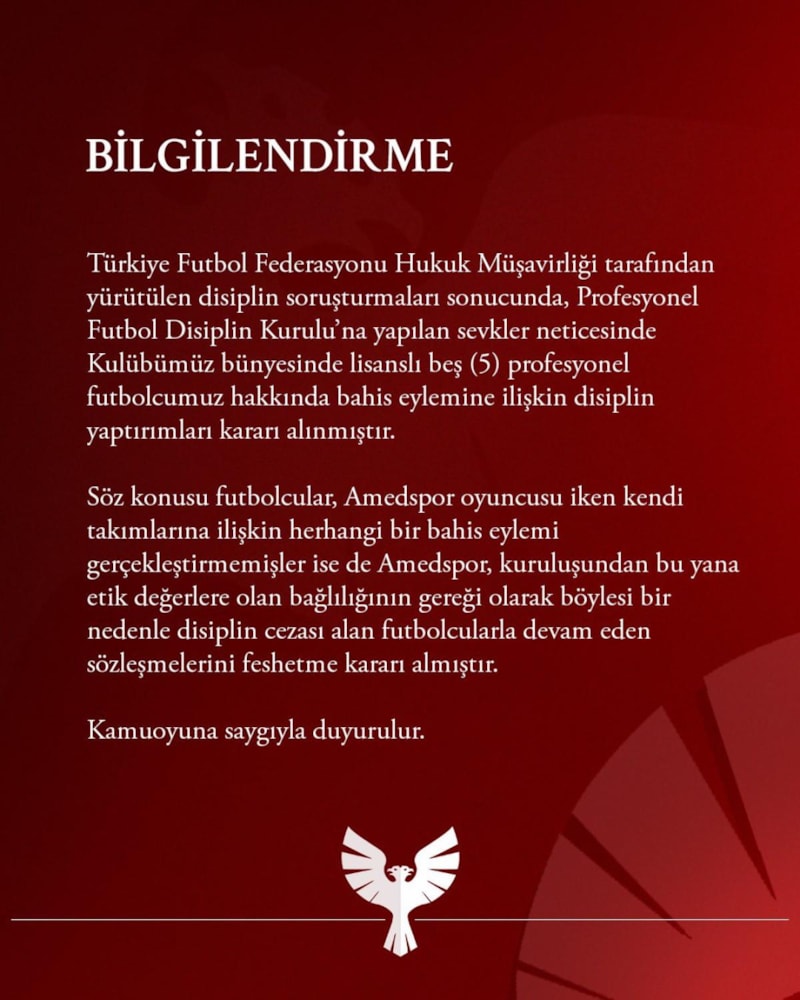 Söz konusu futbolcular, Amedspor oyuncusu iken kendi takımlarına ilişkin herhangi bir bahis eylemi gerçekleştirmemişler ise de Amedspor, kuruluşundan bu yana etik değerlere olan bağlılığının gereği olarak böylesi bir nedenle disiplin cezası alan futbolcularla devam eden sözleşmelerini feshetme kararı almıştır.