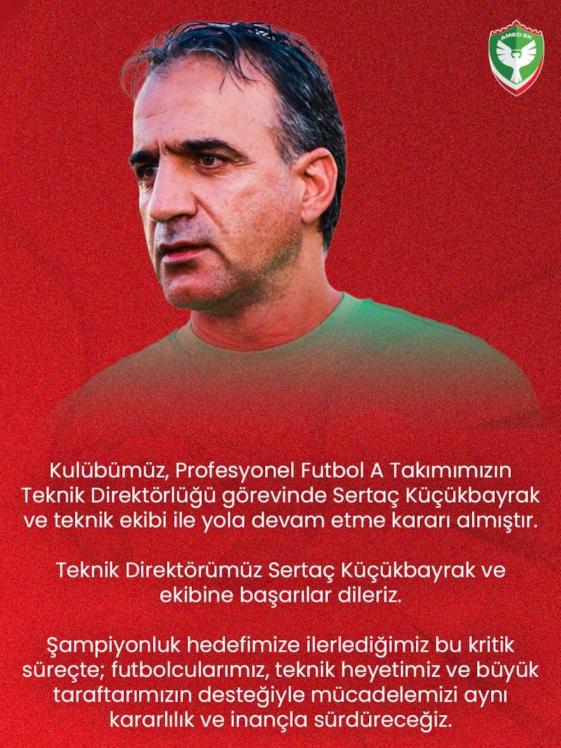 Kulüpten yapılan açıklamada, ''Kulübümüz, profesyonel futbol A takımımızın teknik direktörlüğü görevinde Sertaç Küçükbayrak ve teknik ekibi ile yola devam etme kararı almıştır. Teknik direktörümüz Sertaç Küçükbayrak ve ekibine başarılar dileriz. Şampiyonluk hedefimize ilerlediğimiz bu kritik süreçte, futbolcularımız, teknik heyetimiz ve büyük taraftarımızın desteğiyle mücadelemizi aynı kararlılık ve inançla sürdüreceğiz.'' denildi.